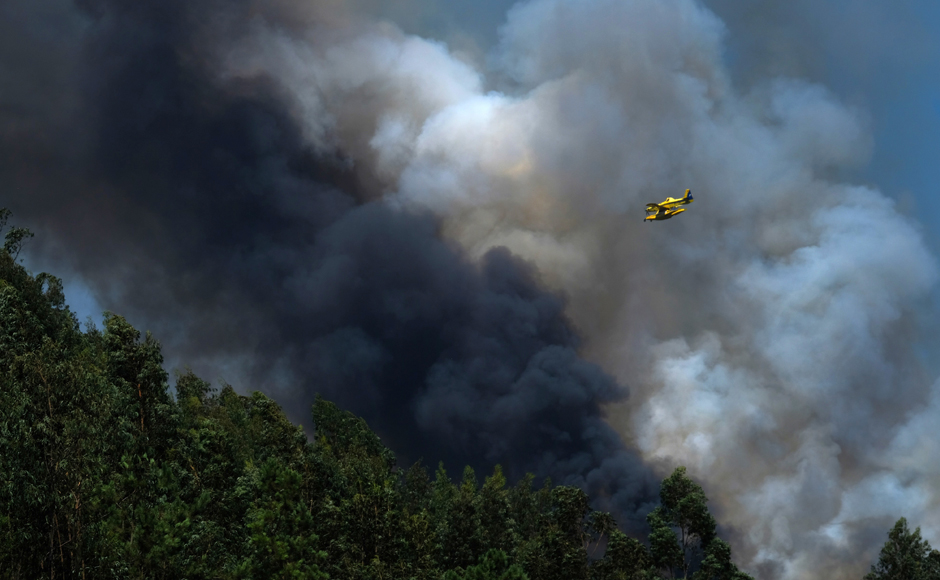 A firefighting airplane flies above a forest fire near Mortagua, northern Portugal on Thursday. Firefighters in Portugal are battling multiple blazes fed by brush in a hot, dry summer for a sixth straight day. A full 186 wildfires were counted Wednesday on Portugal’s mainland. The fires, which are also ravaging southern France, have killed at least four people, burning scores of homes and forcing the evacuation of thousands, including tourists. AP