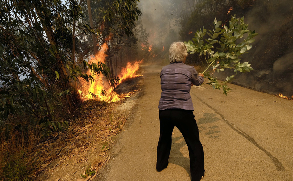 A woman uses a tree branch to fight a fire on the road leading to the village of Parada, near Mortagua. The Madeira fire forced the evacuation of more than 1,000 residents and tourists in the islands. Residents described chaotic nighttime scenes, with people fleeing the flames by car at high speed on the wrong side of the road. AP