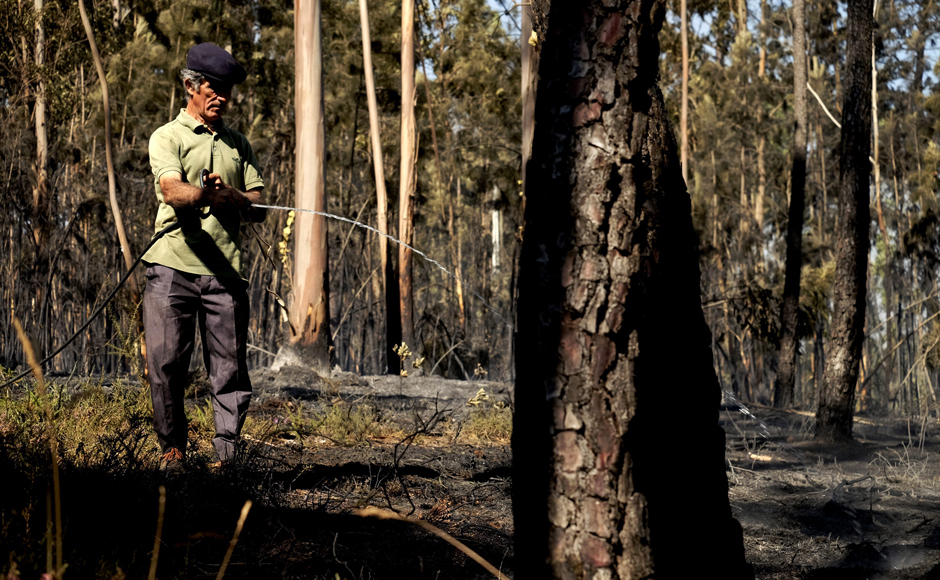 Jos’ Cerveira, 71 years old, waters a burnt forest area to prevent it from reigniting, outside the village of S’o Rom’o, near Mealhada. Miguel Albuquerque, head of Madeira’s regional government, told reporters the three local victims died in their burned homes early Wednesday as the wildfire hit the coastal city in the dark. He said two other people were seriously hurt and one person went missing. At least 37 houses and a five-star hotel had burned down. AP