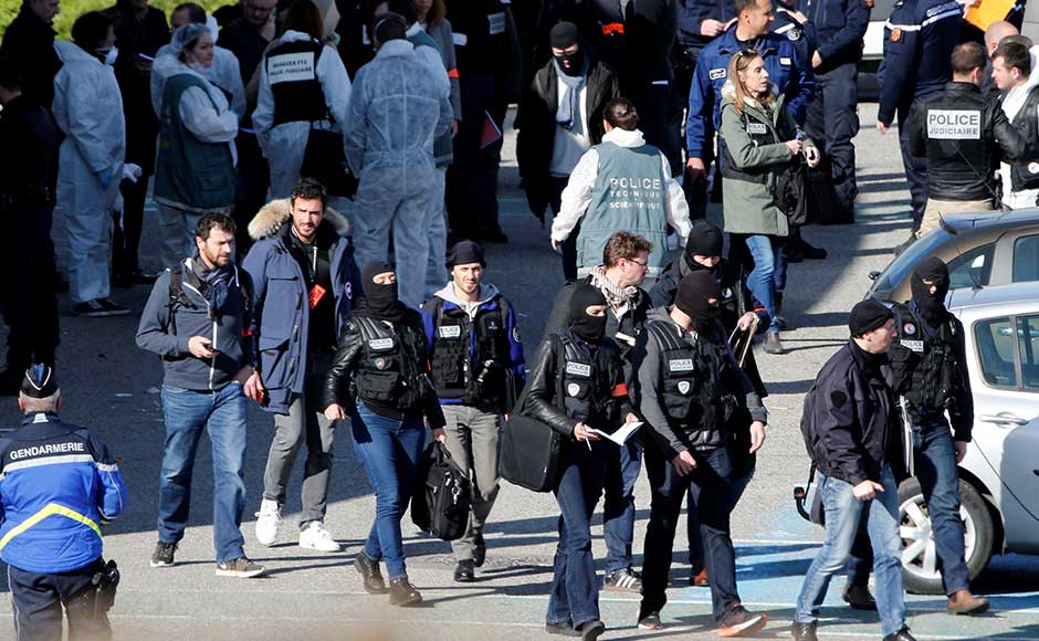 Named as Redouane Lakdim and said by security sources to have Moroccan nationality, the gunman first hijacked a car in Carcassonne, killing a passenger and injuring the driver, before shooting and injuring a policeman who was out jogging. French Police officers cordon off the area during an incident in Trebes. AP