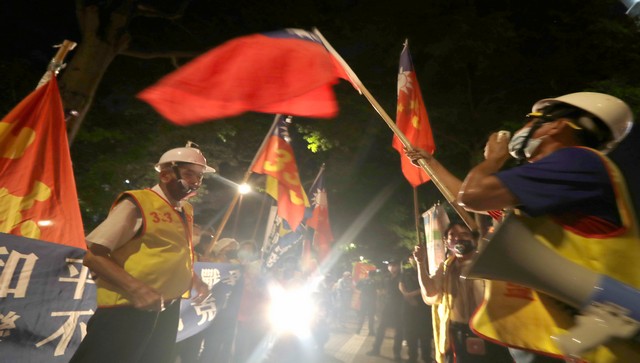People protest outside the hotel Nancy Pelosi is supposed to be staying in. Amid protests and warnings from China, Pelosi said that US will not abandon Taiwan. AP