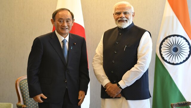 Prime Minister Narendra Modi with former Japanese premier Yoshihide Suga in Tokyo on Tuesday. Twitter/ @MEAIndia