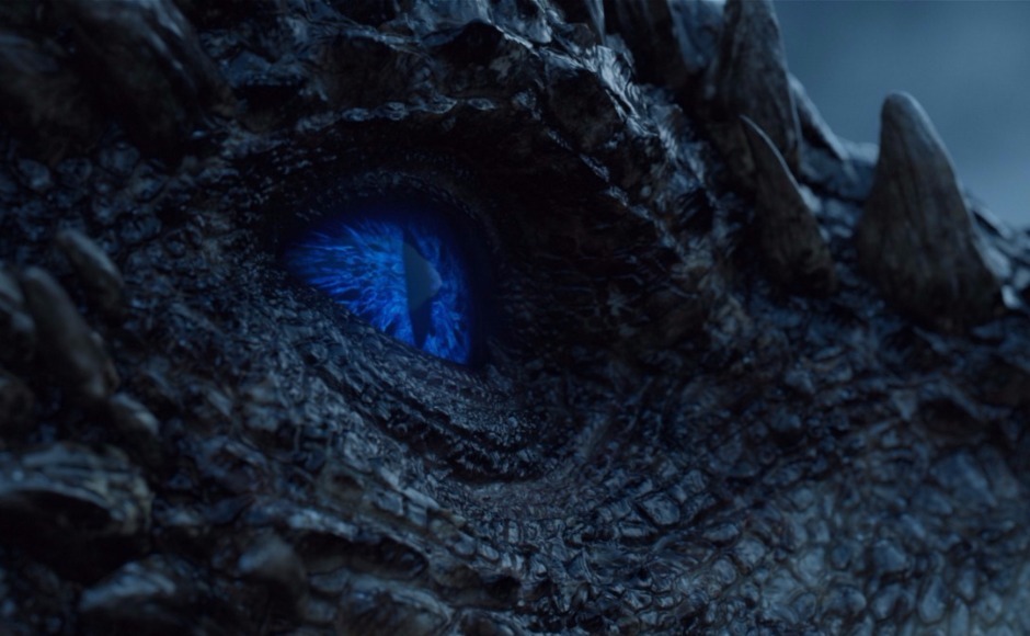 The Night King decides the dragons have wreaked enough damage, takes his icy javelin, and hurls it at Viserion’s breast, felling the poor beast. Image via HBO