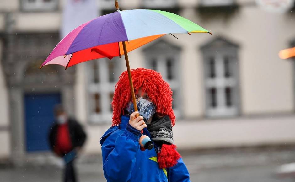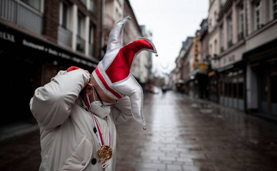 Parades, street festivals and other large gatherings have all been cancelled in Germany this year. But organisers in Duesseldorf, one of the German Rhineland’s main Carnival strongholds, didn’t want to let Rose Monday in 2021 go completely without the traditional caricatures of current events. Here, a young carnival reveller dressed as a clown holds an umbrella in the empty old town in Duesseldorf. AP Photo/Martin Meissner