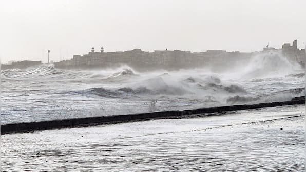 High waves crash against the beachline ahead of Cyclone Biporjoy’s expected landfall, in Porbandar. Cyclone Biparjoy has “extensive damaging potential” and is likely to impact Gujarat’s Kutch, Devbhumi Dwarka and Jamnagar districts the most, the India Meteorological Department (IMD) said on Tuesday. PTI