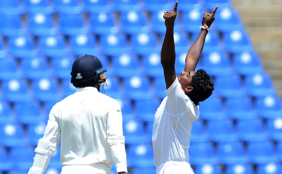 Vishwa Fernando picked his 2nd wicket of the innings by getting rid of Wriddhiman Saha early on Day 2. AP