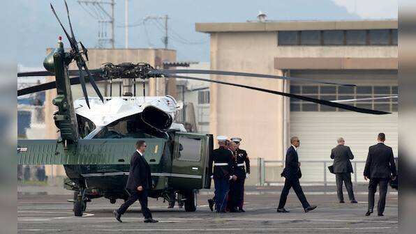 US President Barack Obama on Friday became the first American president to confront the historic and haunted ground of Hiroshima. Obama, third from right, walks off Marine One at the landing zone in Hiroshima on Friday. AP