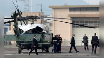 US President Barack Obama on Friday became the first American president to confront the historic and haunted ground of Hiroshima. Obama, third from right, walks off Marine One at the landing zone in Hiroshima on Friday. AP