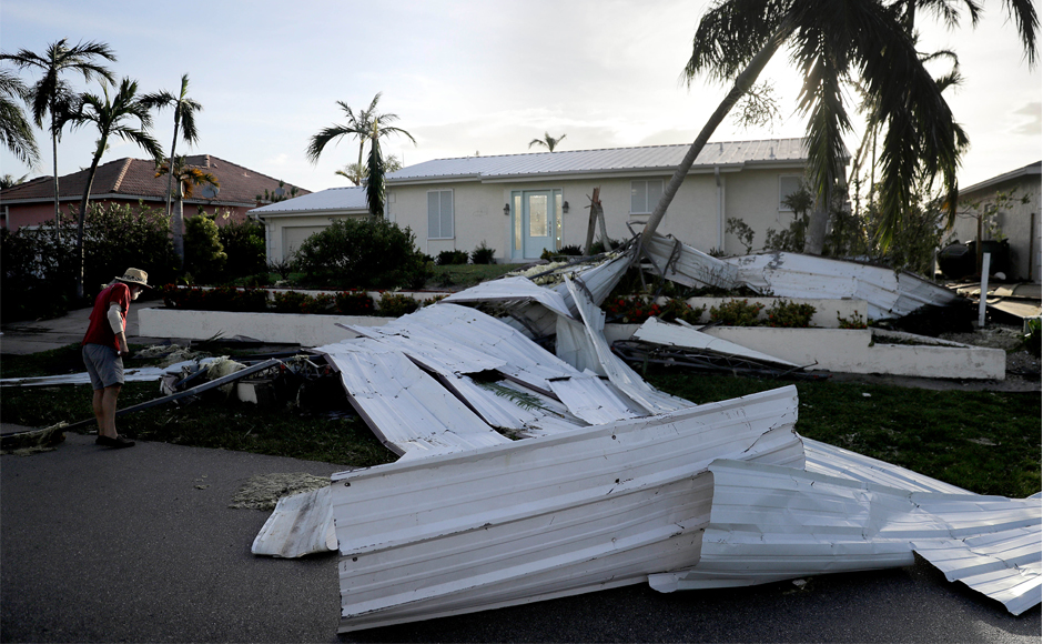 A damaged roof is strewn across a home’s lawn from Hurricane Irma in Marco Island, Florida. Hurricane Irma could make a $300 billion dent in US economy, according to analysts. AP