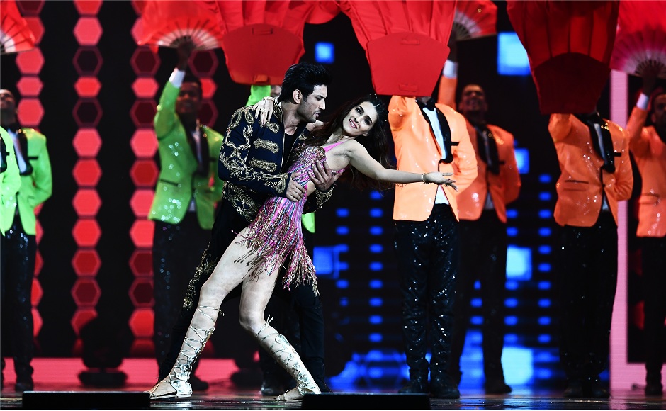 Bollywood actor Sushant Singh Rajput and actress Kriti Sanon perform during IIFA award of the 18th International Indian Film Academy (IIFA) Festival at the MetLife Stadium in East Rutherford, New Jersey, on July 15, 2017. / AFP PHOTO / JEWEL SAMAD
