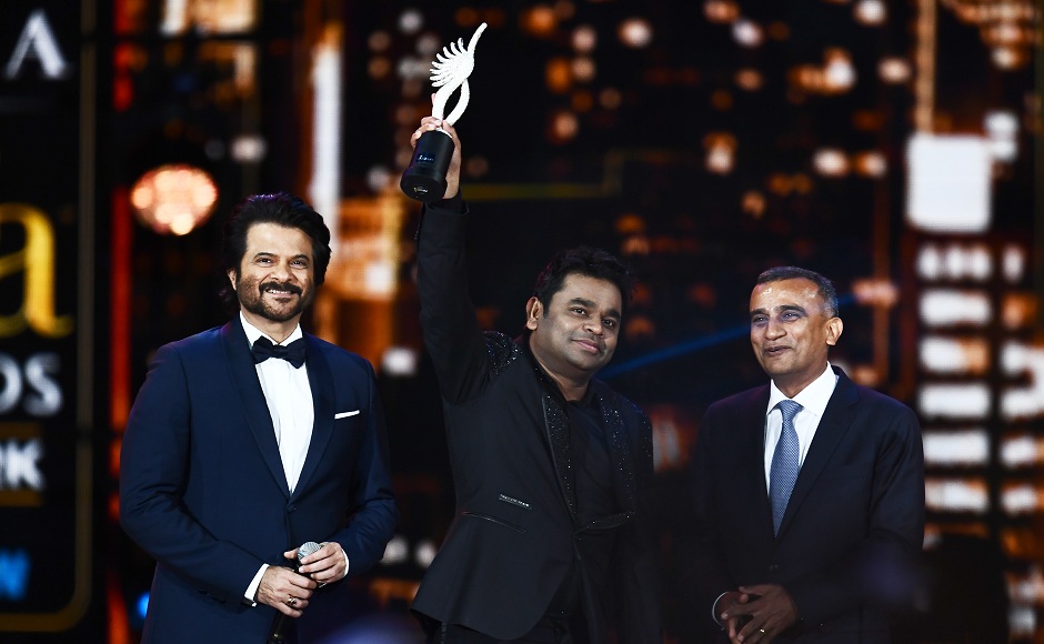 Bollywood music composer/singer AR Rahman (C) accepts an award during the 18th International Indian Film Academy (IIFA) Festival at the MetLife Stadium in East Rutherford, New Jersey, on July 15, 2017. / AFP PHOTO / JEWEL SAMAD