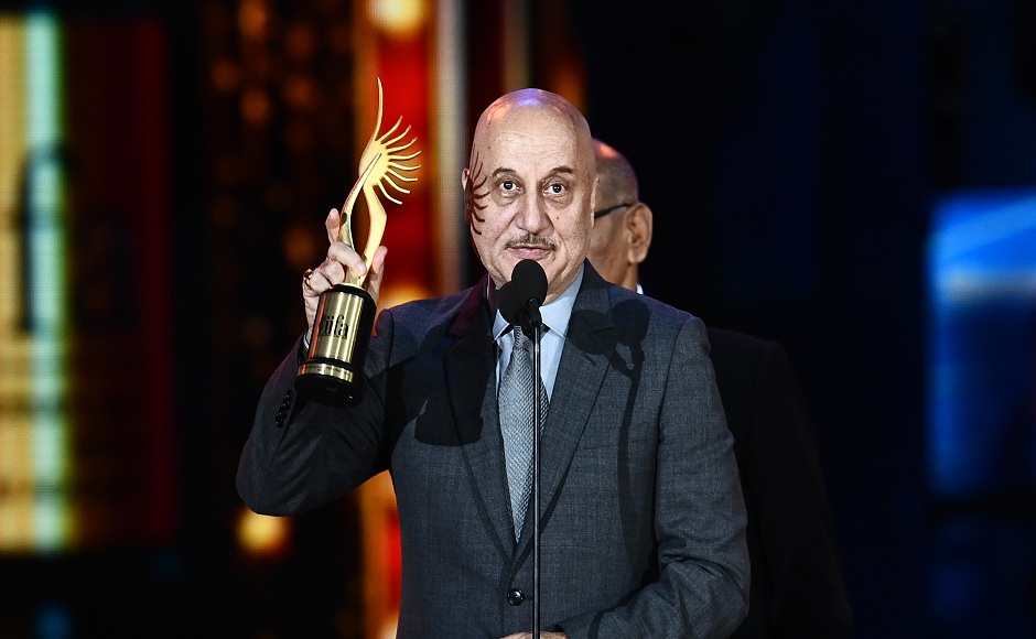 Winner of Performance in a Supporting Role - Male, Bollywood actor Anupam Kher for “M.S. Dhoni” accepts the award during 18th International Indian Film Academy (IIFA) Festival at the MetLife Stadium in East Rutherford, New Jersey, on July 15, 2017. / AFP PHOTO / JEWEL SAMAD