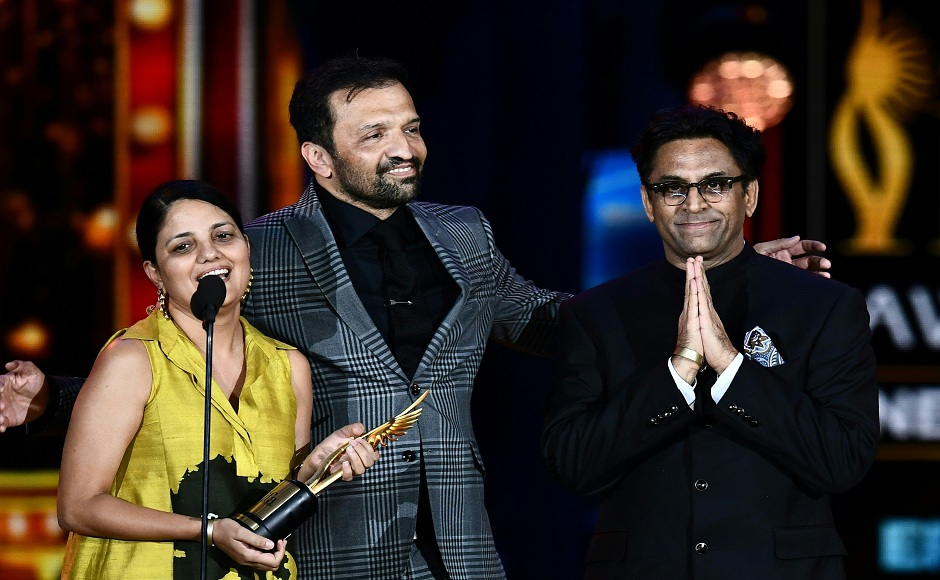 Best Picture Neerja’s director Ram Madhvani (R) and staff thank the audience on stage during the IIFA Awards July 15, 2017 at the MetLife Stadium in East Rutherford, New Jersey during the 18th International Indian Film Academy (IIFA) Festival. / AFP PHOTO / Jewel SAMAD