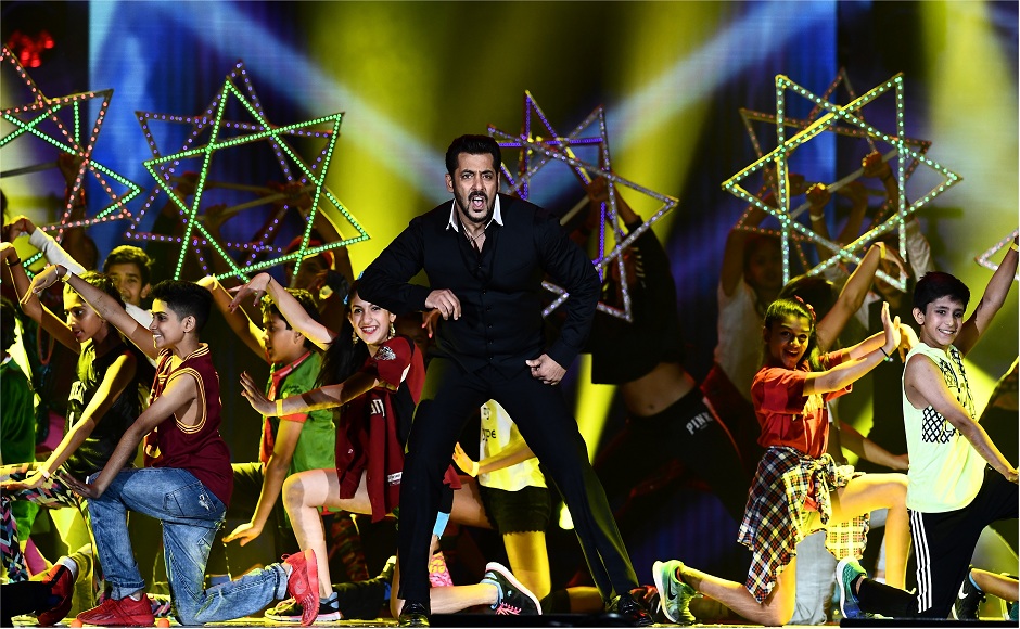 Bollywood actor Salman Khan (C) performs on stage during 18th International Indian Film Academy (IIFA) Festival at the MetLife Stadium in East Rutherford, New Jersey, on July 16, 2017. / AFP PHOTO / Jewel SAMAD