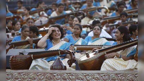 Sahasra Veena Jhenkara, a musical concert where 1110 Veena artistes including men, women and children performed together to set a record was organised by Art of Living. Images of the performance.