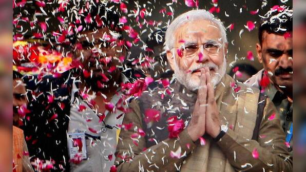 Gujarat Chief Minister Narendra Modi is welcomed with flowers for the BJP chief minister’s conference at the party office in New Delhi on Tuesday. PTI