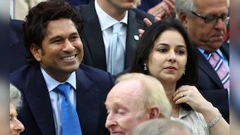 Sachin Tendulkar and Anjali Tendulkar watch on from the Royal Box on Centre Court. Getty Images