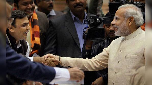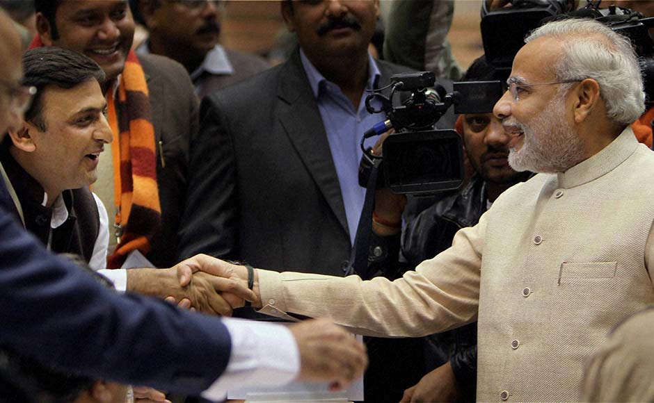 Gujarat Chief Minister Narendra Modi shakes hands with UP Chief Minister Akhilesh Yadav during the 57th National Development Council (NDC) meeting in New Delhi. PTI