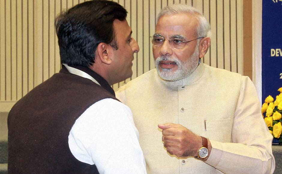 Gujarat Chief Minister Narendra Modi and UP CM Akhilesh Yadav during the 57th National Development Council (NDC) meeting in New Delhi . PTI