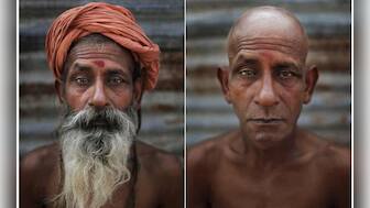 In this combination of two photos taken on 13 February, 2013, Hindu holy man Baba Ramshwal poses before, left, and after, right, he had his head and face shaved as part of an initiation ritual where he was to become a Naga Sadhu. AP