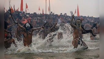 Naga Sadhus, run naked into the water at Sangam, the confluence of the Ganges, Yamuna and mythical Saraswati river, during the royal bath on Makar Sankranti at the start of the Maha Kumbh Mela in Allahabad. Kevin Frayer/AP