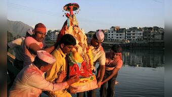 CRPF personnel immersing an idol of Lord Ganesh in River Jehlum at the end of Ganesh Utsav in Srinagar on Saturday. PTI
