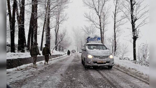 Central Reserve Police Force (CRPF) personnel patrol along the 300-km long Srinagar-Jammu National highway near Qazigund during heavy snowfall on Monday. PTI