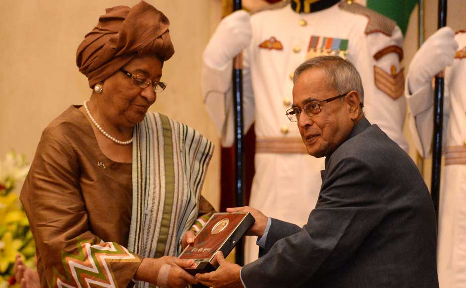 President Pranab Mukherjee presenting the Indira Gandhi Prize for Peace, Disarmament and Development 2012 to the President of the Republic of Liberia, Ellen Johnson Sirleaf, at Rashtrapati Bhavan in New Delhi on 12 September 2013. Image courtesy PIB