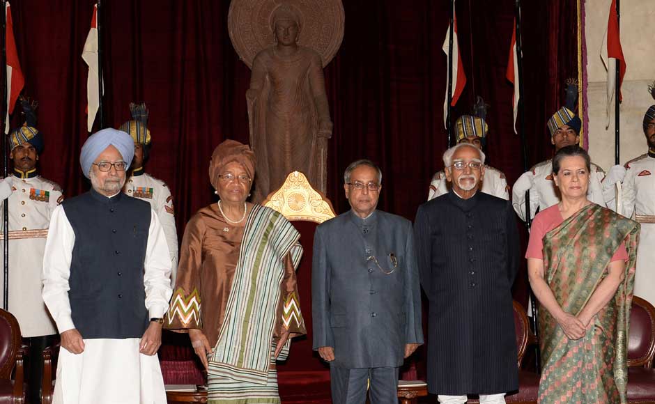 President Pranab Mukherjee, Vice President Hamid Ansari, Prime Minister Manmohan Singh and Chairperson, National Advisory Council, Sonia Gandhi with the winner of Indira Gandhi Prize for Peace, Disarmament and Development, Ellen Johnson Sirleaf, the President of the Republic of Liberia, at Rashtrapati Bhavan, in New Delhi on 12 September 2013. Image courtesy PIB