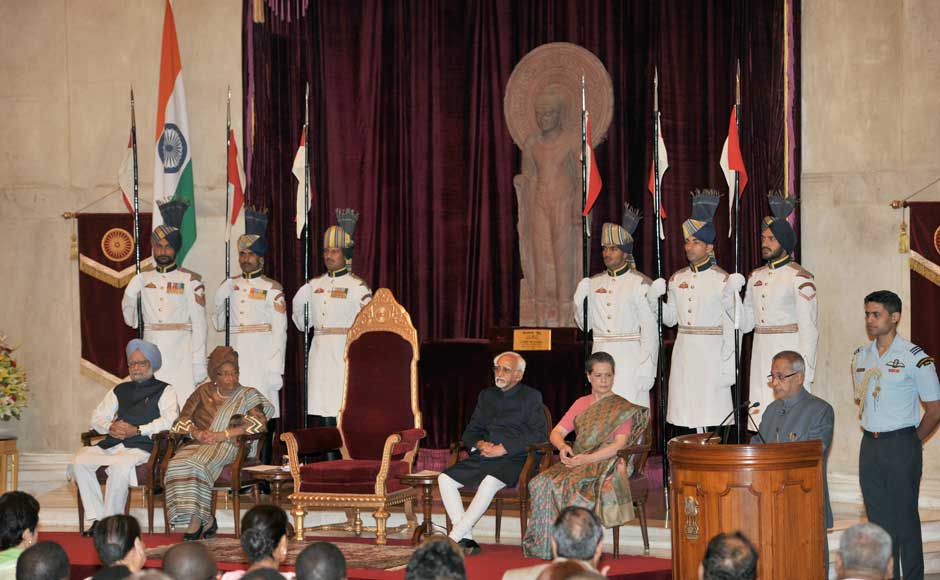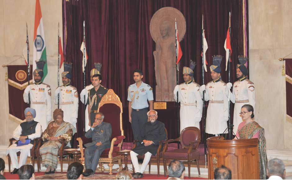 President Pranab Mukherjee addressing at the Indira Gandhi Prize for Peace, Disarmament and Development 2012 presentation ceremony, at Rashtrapati Bhavan, in New Delhi on September 12, 2013. Liberia President Ellen Johnson Sirleaf, Vice President Hamid Ansari, Prime Minister Manmohan Singh and Chairperson, National Advisory Council, Sonia Gandhi are also seen. Image courtesy PIB
