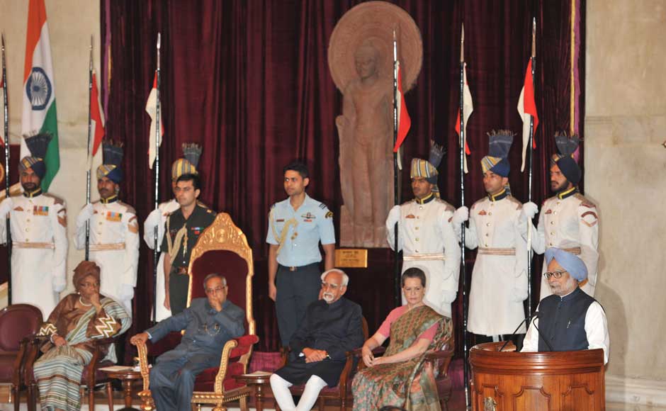 Prime Minister Manmohan Singh addressing at the Indira Gandhi Prize for Peace, Disarmament and Development 2012 presentation ceremony, at Rashtrapati Bhavan, in New Delhi on 12 September 2013. Liberia President Ellen Johnson Sirleaf, President Pranab Mukherjee, Vice President Hamid Ansari and the Chairperson, National Advisory Council Sonia Gandhi are also seen. Image courtesy PIB