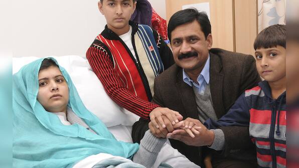 Malala Yousufzai with her father Ziauddin and her two younger brothers Khushal Khan and Atal Khan, at the The Queen Elizabeth Hospital in Birmingham. Reuters