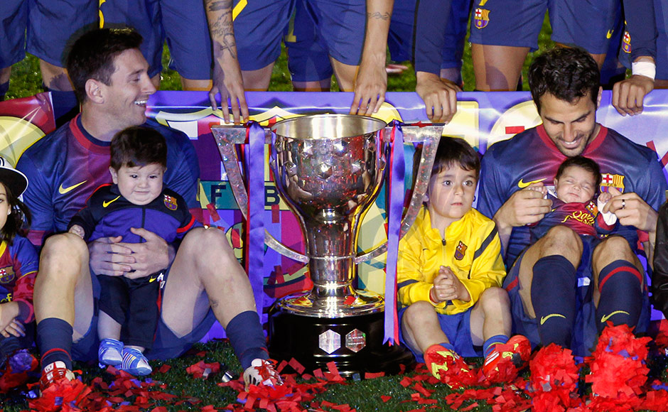 Barcelona’s Lionel Messi (L) holds his son Thiago next to teammate Cesc Fabregas (R) and his daughter Lia, as they pose with the trophy during the Spanish league first division trophy celebrations at Camp Nou stadium in Barcelona. Albert Gea/Reuters