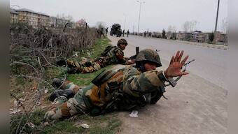 Security personnel take position during the encounter with millitants near the CRPF camp at Bemina in Srinagar on Wednesday. PTI