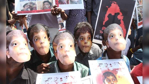 Students wearing masks of LTTE chief Prabhakaran’s son Balachandran protesting in Chennai. Recent images had revealed the brutal manner in which Balachandran was killed during the Sri Lankan Civil war. Firstpost