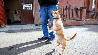 A dog waits outside a polling station during the general election in London. Soon after voting began, #DogsAtPollingStations became one of the highest trends on X, with adorable polling pooches seen next to signs. Reuters