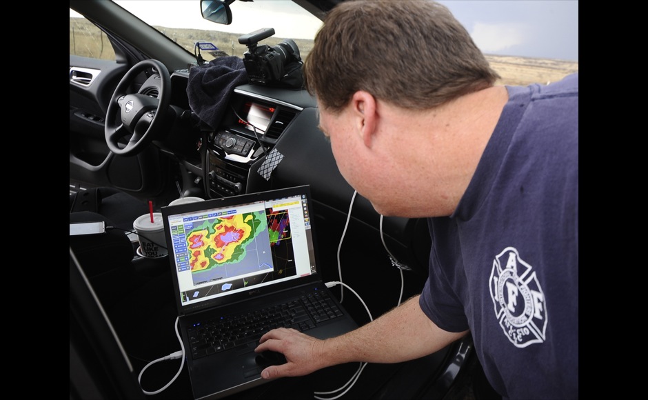 Storm chaser photographer Brad Mack checks out the radar on his laptop as thunderstorms supercells pass through areas in Erick, Oklahoma late April 23, 2014. The thunder storms on Wednesday were a precursor of what’s forecast for this coming weekend Saturday, Sunday, and Monday that could be the most significant multi-day tornado outbreak in the U.S. since 2011. REUTERS/Gene Blevins