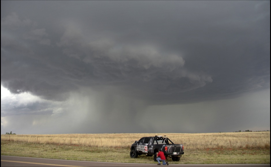 A large TVS (tornadic vortex signature) thunderstorm supercell passes over storm chaser Brad Mack in Graham, Texas late April 23, 2014. The thunder storms on Wednesday were a precursor of what’s forecast for this coming this weekend that could be the most significant multi-day tornado outbreak in the U.S. since 2011. Picture taken April 23, 2014. REUTERS/Gene Blevins