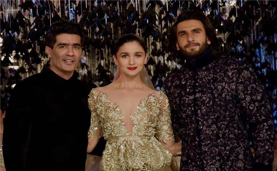 Manish Malhotra, Alia Bhatt and Ranveer Singh at the FDCI’s India Couture Week 2017 at the Taj Palace hotel on 30 July, 2017 in New Delhi, India. (Photo by Rubina A. Khan/Getty Images)