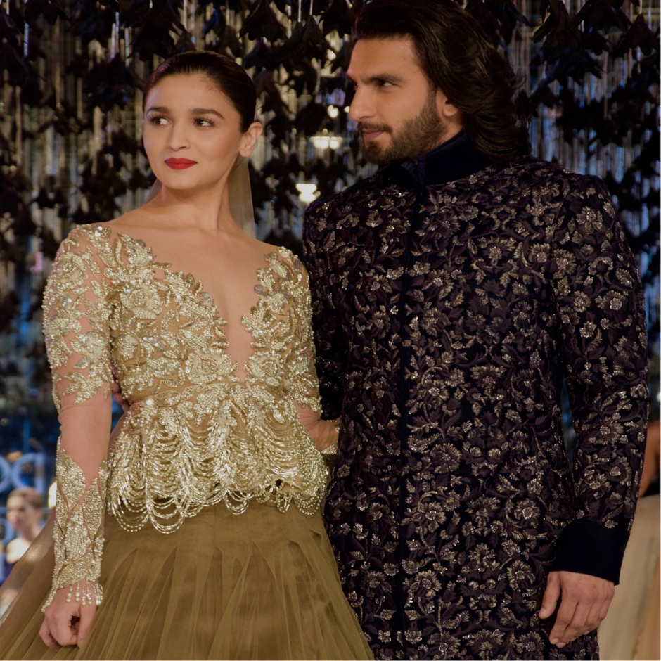 Bollywood actors Ranveer Singh and Alia Bhatt walk as show stoppers for designer Manish Malhotra on the last day of the India Couture Week.