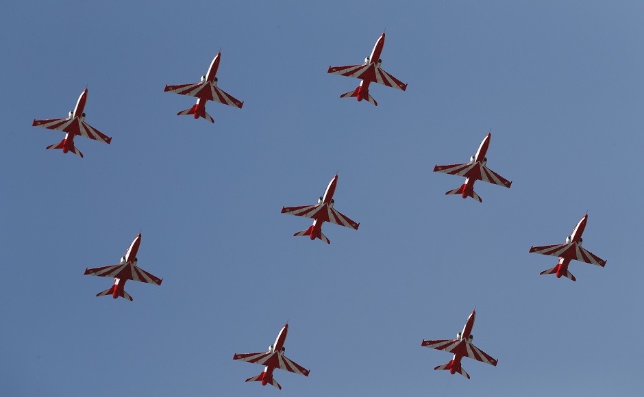 Sixty-one aircraft registered for flying and static display this year, while 373 aerospace firms registered for participation in the expo. Seen here are training aircraft Dornier, Hawk and HTT-40 in a flypast. PTI