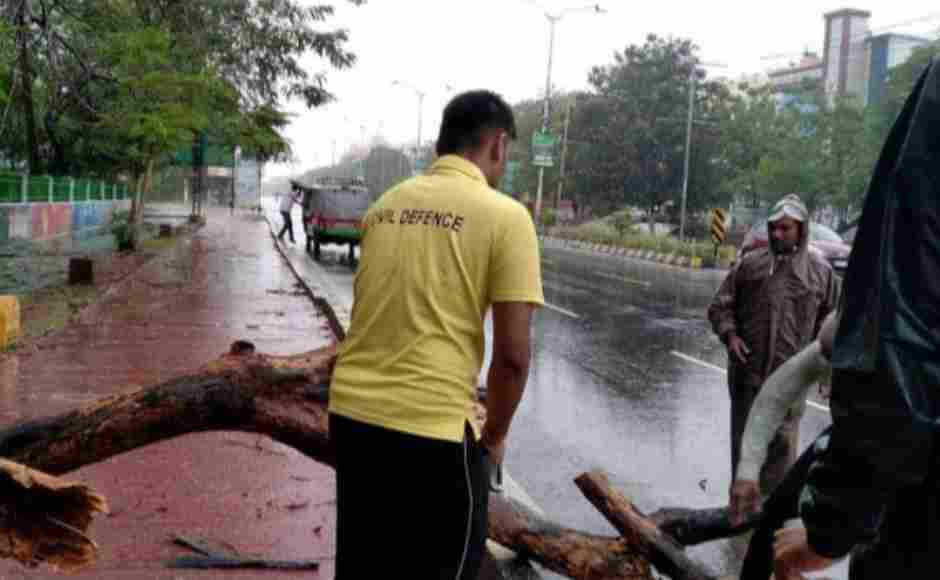 Traffic movement in a road leading to the Capital Hospital in Bhubaneswar was blocked after some trees were uprooted. Sonali Singh/101Reporters