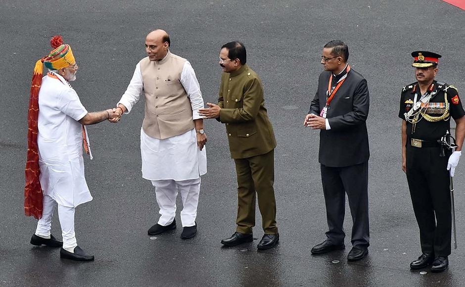 Wearing a white kurta and a colourful safa, the prime minister referred to BJP’s big win in the general election to Lok Sabha and said his government’s return to power showed as to how despair had given way to hope. Modi (seen here) greets Defence Minister Rajnath Singh. Image courtesy: Twitter@PIBIndia