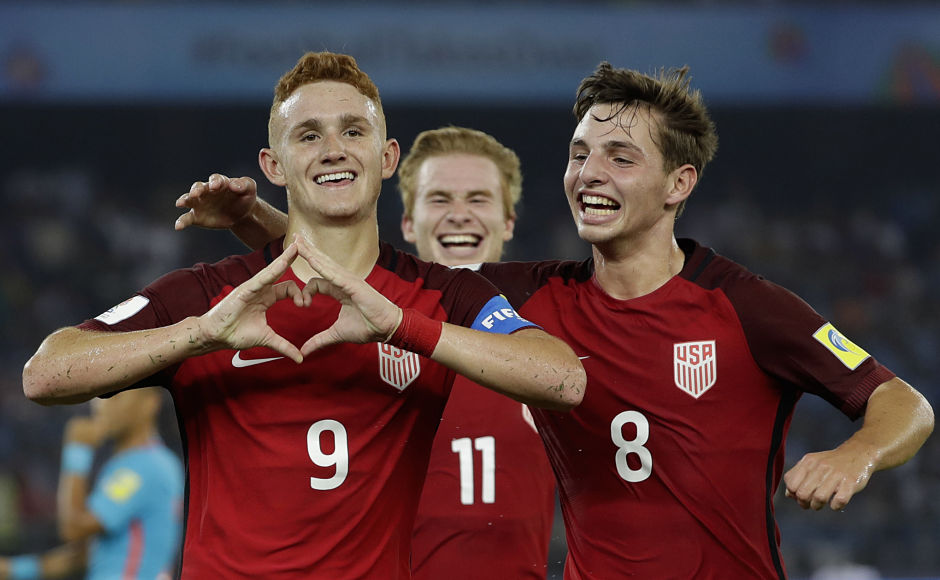 US footballer Josh Sargent celebrates his goal against India during their FIFA U-17 World Cup match in New Delhi. The United States of America defeated India 3-0. AP