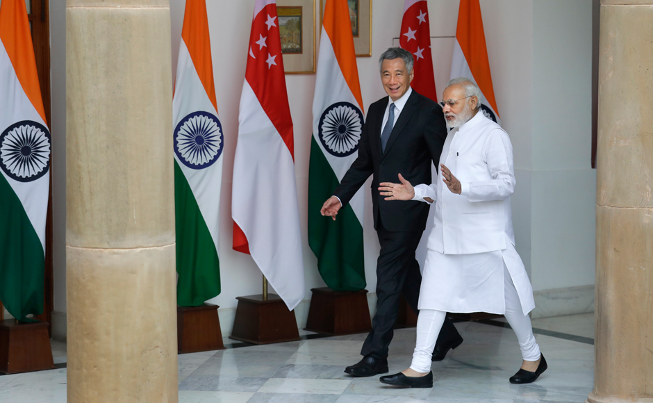 Indian Prime Minister Narendra Modi, right, talks with Singapore Prime Minister Lee Hsien Loong as they walk for a delegation level meeting, in New Delhi, India, on Tuesday. Lee is on a five day visit to India. AP