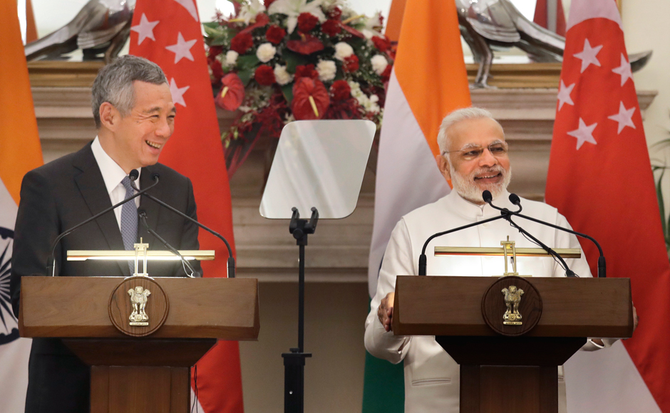 Prime Minister Narendra Modi makes a media statement beside his Singapore counterpart Lee Hsien Loong in New Delhi, India on Tuesday. AP