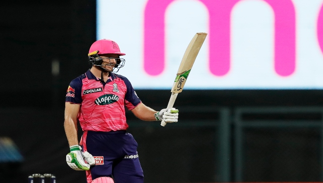 Jos Buttler of Rajasthan Royals celebrating his half century during match 13 of the TATA Indian Premier League 2022 (IPL season 15) between the Rajasthan Royals and the Royal Challengers Bangalore held at the Wankhede Stadium in Mumbai on the 5th April 2022 Photo by Saikat Das / Sportzpics for IPL