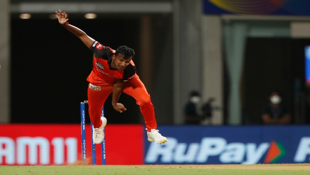 T. Natarajan of the Sunrisers Hyderabad bowls during match 21 of the TATA Indian Premier League 2022 (IPL season 15) between the Sunrisers Hyderabad and the Gujarat Titans held at the DY Patil Stadium in Mumbai on the 11th April 2022. Photo by Pankaj Nangia / Sportzpics for IPL