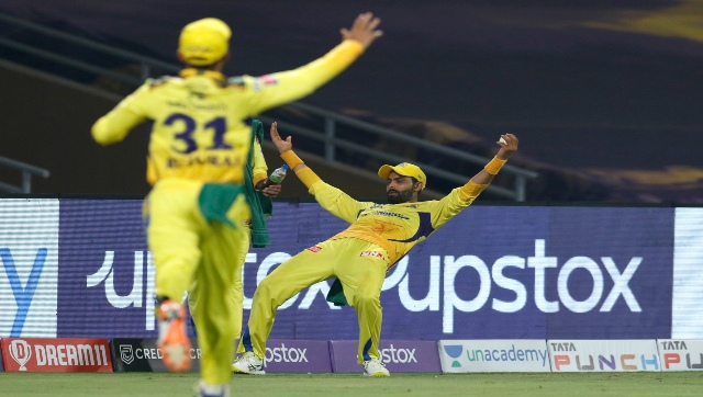 Ravindra Jadeja Captain of the Chennai Super Kings takes catch of Dinesh Karthik of Royal Challengers Bangalore during match 22 of the TATA Indian Premier League 2022 (IPL season 15) between the Chennai Superkings and the Royal Challengers Bangalore held at the DY Patil Stadium in Mumbai on the 12th April 2022. Photo by Deepak Malik / Sportzpics for IPL