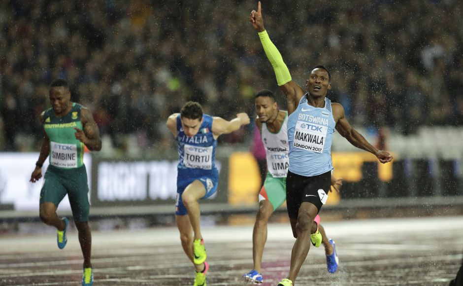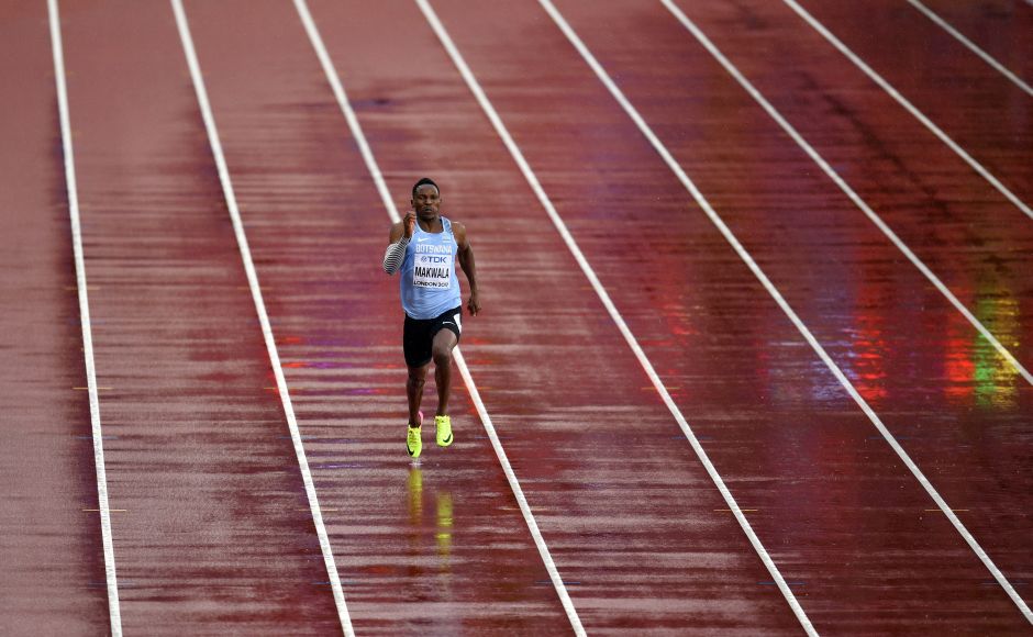 Needing to run 20.53 seconds or faster to advance, Isaac Makwala braved the rain and cold at the Olympic Stadium and finished in 20.20. AP